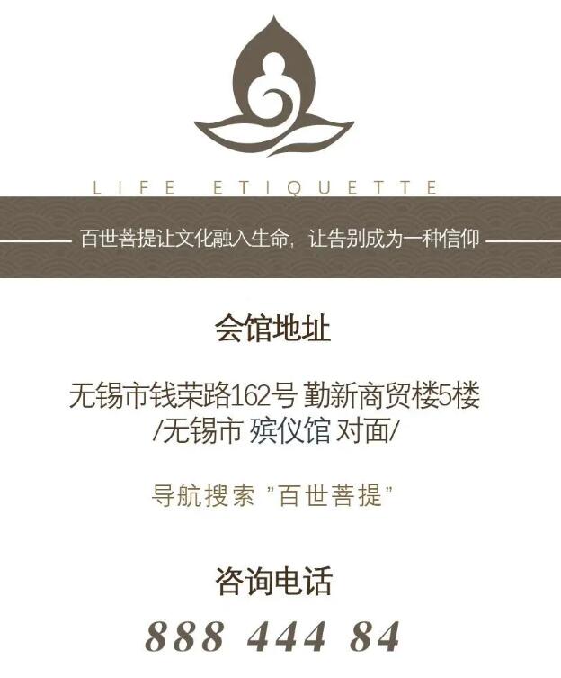 无锡市百世菩提礼仪服务有限公司2019-2020 版权所有违者必究 官网:http://www.bsptfw.cn 网址:www.bsptfw.com 地址:无锡滨湖区钱荣路162号勤新商贸楼5楼